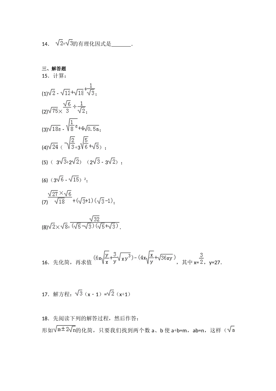 第十六章卷(2)一、选择题1.下列各式中,正确的是()A.2<<3B.3<<4C.4<<5D.14<<162.下列二次根式中,是最简二次根式的是()A.B.C.D.3.把二次根式(y>0)化为最简二次根式结果是()A.(y...