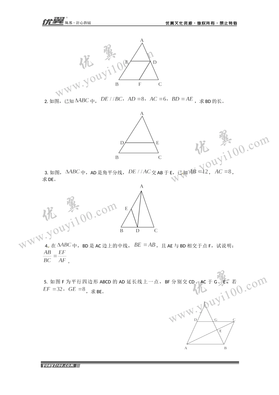 27.2.1相似三角形的判定第1课时平行线分线段成比例一.填空题:1.如图,梯形ABCD,AD//BC,延长两腰交于点E,若,则第1题图第2题图第3题图第4题图2.如图,中,EF//BC,AD交EF于G,已知,则.3.如图,梯形ABCD中,,...