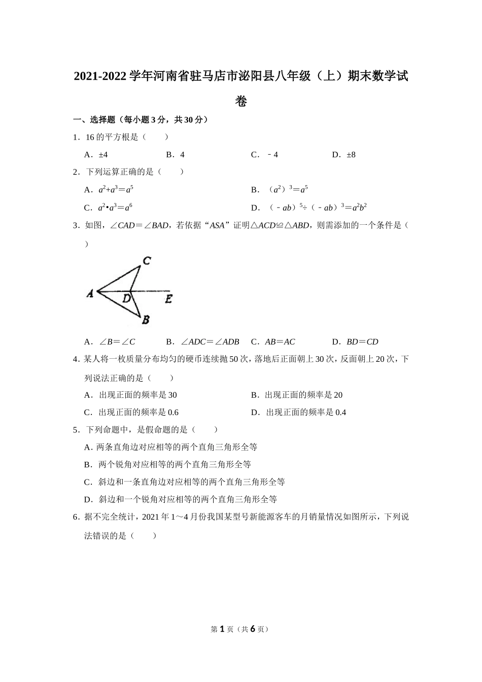 2021-2022学年河南省驻马店市泌阳县八年级(上)期末数学试卷一、选择题(每小题3分,共30分)1.16的平方根是()A.±4B.4C.﹣4D.±82.下列运算正确的是()A.a2+a3=a5B.(a2)3=a5C.a2•a3=a6D.(...