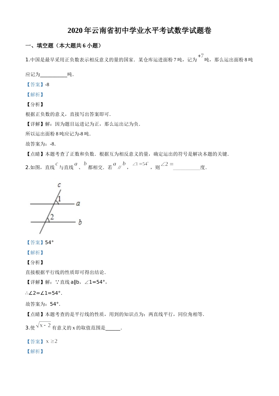 2020年云南省初中学业水平考试数学试题卷一、填空题(本大题共6小题)1.中国是最早采用正负数表示相反意义的量的国家.某仓库运进面粉7吨,记为吨,那么运出面粉8吨应记为___________吨.【答案】-8【解析】【分...