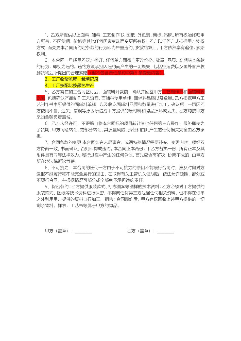 安徽轻工国际贸易股份有限公司服装加工合同范本(一)合同编号:______________附件:份甲方:______________乙方:______________双方本着平等合作、互惠互利的原则,特签订本合同,以资双方共同遵守。本合同一...