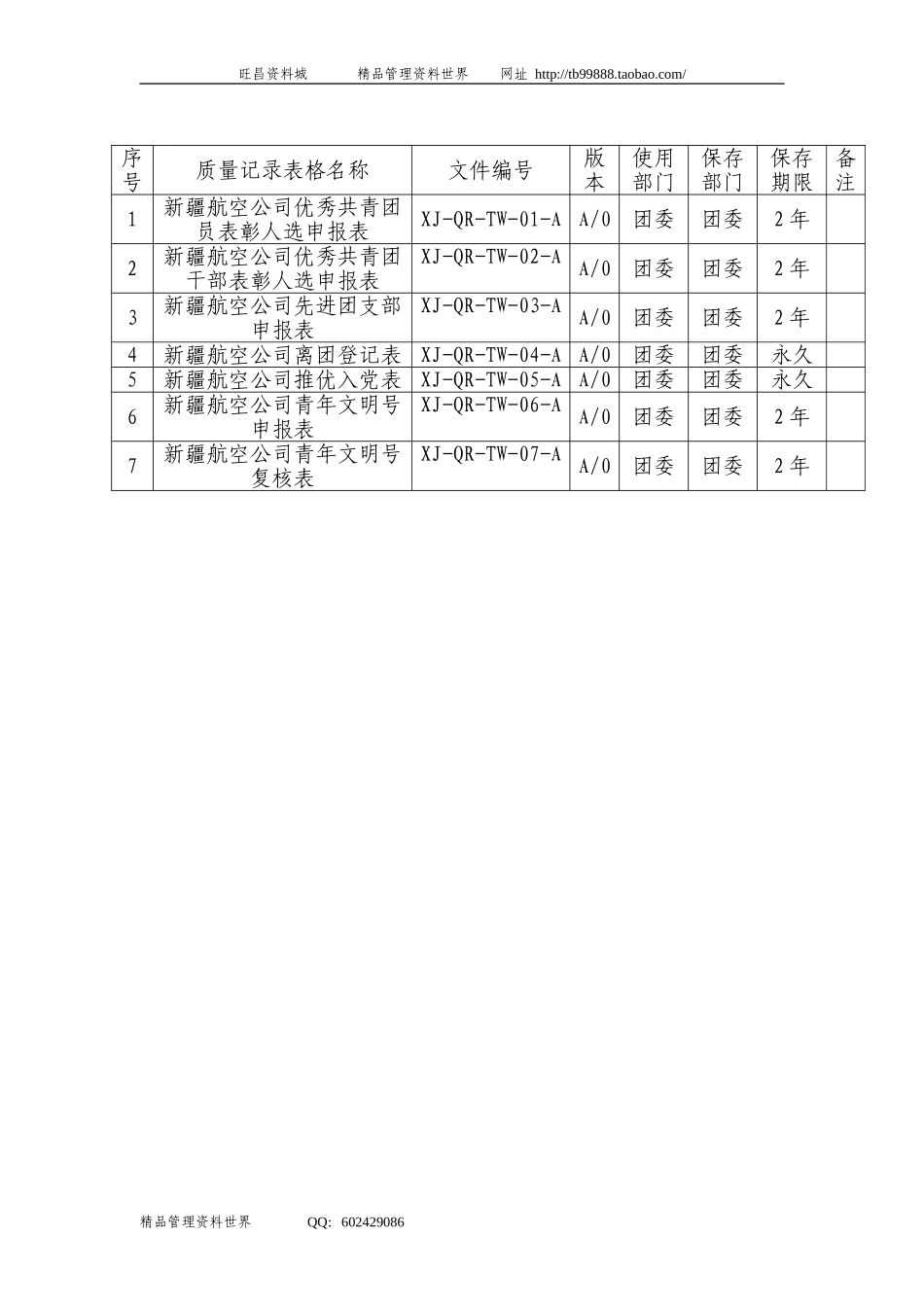 旺昌资料城精品管理资料世界网址http://tb99888.taobao.com/序号质量记录表格名称文件编号版本使用部门保存部门保存期限备注1新疆航空公司优秀共青团员表彰人选申报表XJ-QR-TW-01-AA/0团委团委2年2新疆航空公司优...