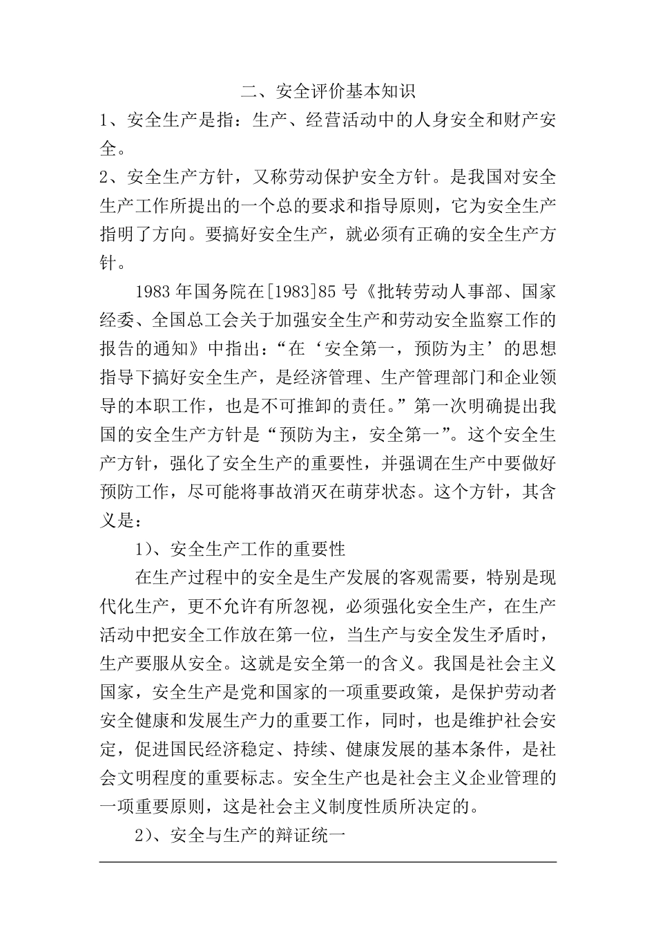 二、安全评价基本知识1、安全生产是指:生产、经营活动中的人身安全和财产安全。2、安全生产方针,又称劳动保护安全方针。是我国对安全生产工作所提出的一个总的要求和指导原则,它为安全生产指明了方向。要搞好...