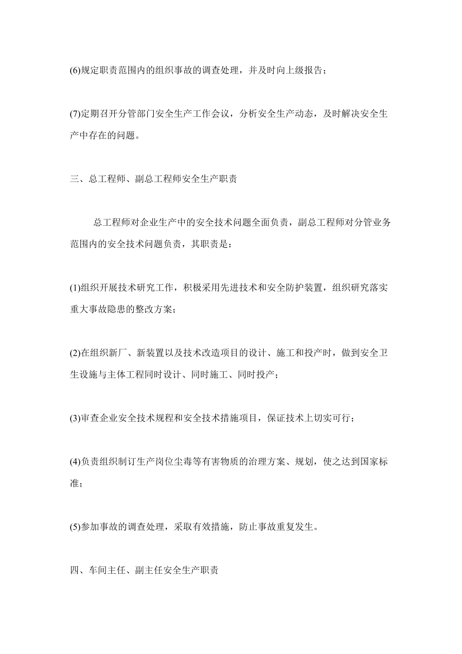 企业安全生产责任制安全生产责任制就是对各级领导、各个部门、各类人员所规定的在他们各自职责范围内对安全生产应负责任的制度。一、厂长(经理)安全生产职责厂长(经理)对企业的安全生产的第一负责人,对本企业安...