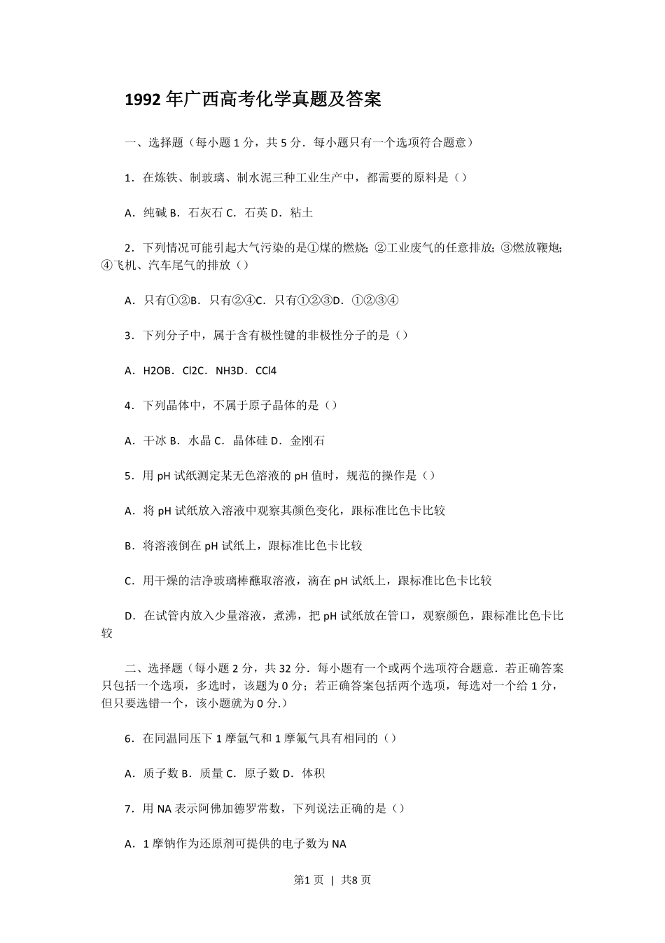 第1页|共8页1992年广西高考化学真题及答案一、选择题(每小题1分,共5分.每小题只有一个选项符合题意)1.在炼铁、制玻璃、制水泥三种工业生产中,都需要的原料是()A.纯碱B.石灰石C.石英D.粘土2.下列情况...