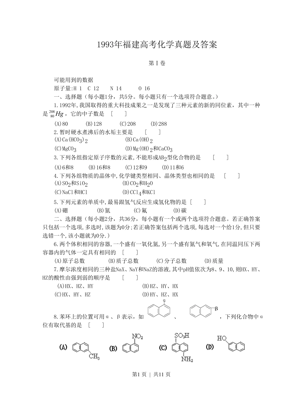 第1页|共11页1993年福建高考化学真题及答案第Ⅰ卷可能用到的数据原子量:H1C12N14O16一、选择题(每小题1分,共5分。每小题只有一个选项符合题意。)1.1992年,我国取得的重大科技成果之一是发现了三种元素的新的同...