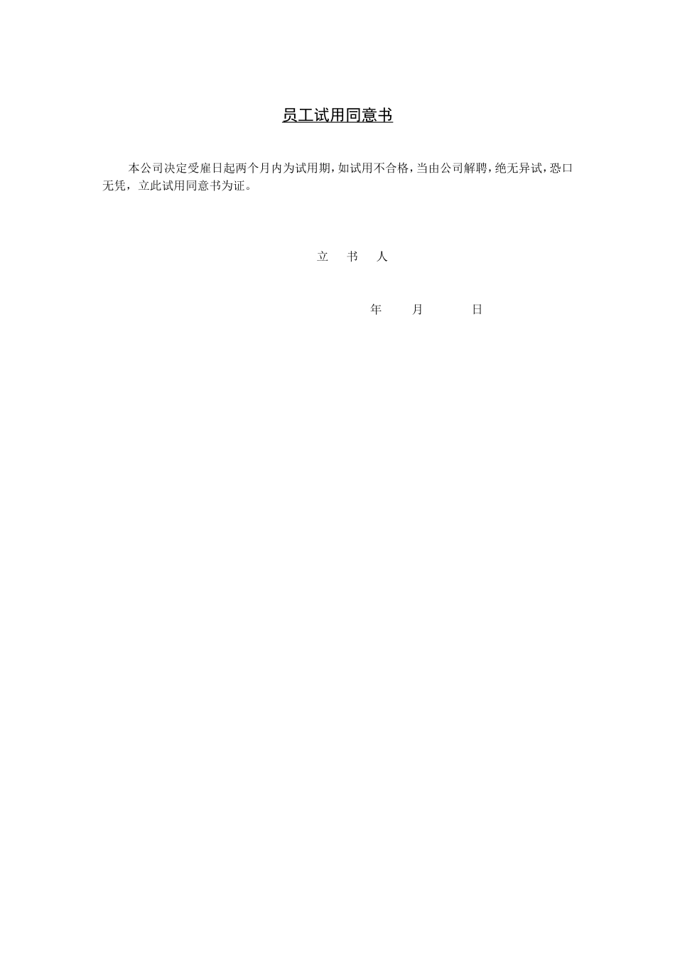 员工试用同意书本公司决定受雇日起两个月内为试用期,如试用不合格,当由公司解聘,绝无异试,恐口无凭,立此试用同意书为证。立书人年月日