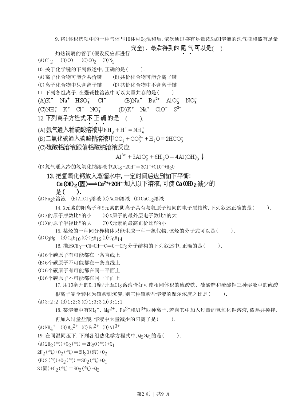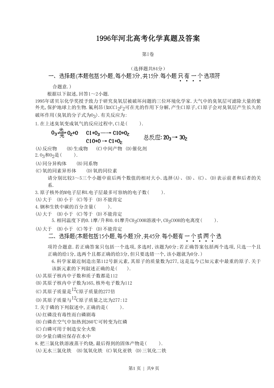 第1页|共9页1996年河北高考化学真题及答案第I卷(选择题共84分)合题意.)根据以下叙述,回答1~2小题.1995年诺贝尔化学奖授予致力于研究臭氧层被破坏问题的三位环境化学家.大气中的臭氧层可滤除大量的紫外光,保护...