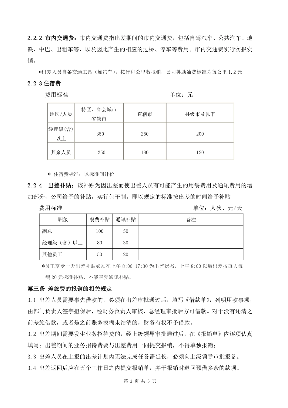 第1页共3页公司出差管理制度为了进一步规范企业员工出差管理工作,强化成本管理意识,提高办事效率,同时加强企业财务合理控制差旅费的支出,特制订本制度。本制度所称出差,是指员工因工作需要,受公司派遣前往...
