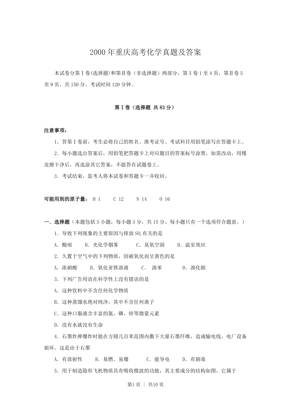 第1页|共10页2000年重庆高考化学真题及答案本试卷分第Ⅰ卷(选择题)和第Ⅱ卷(非选择题)两部分,第Ⅰ卷1至4页,第Ⅱ卷5至9页,共150分。考试时间120分钟。第Ⅰ卷(选择题共83分)注意事项:1.答第Ⅰ卷前,考生必...