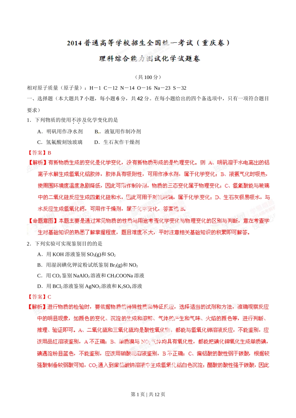 2014年高考化学试卷(重庆)(解析卷).doc_第1页