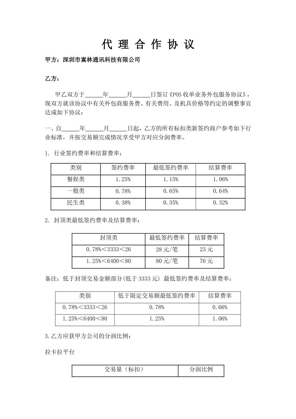 代理合作协议甲方:深圳市嵩林通讯科技有限公司乙方:甲乙双方于年月日签订《POS收单业务外包服务协议》,现双方就该协议中有关外包商服务费、有关费用、及机具价格等约定的调整事宜达成如下协议:一、自年月日起...