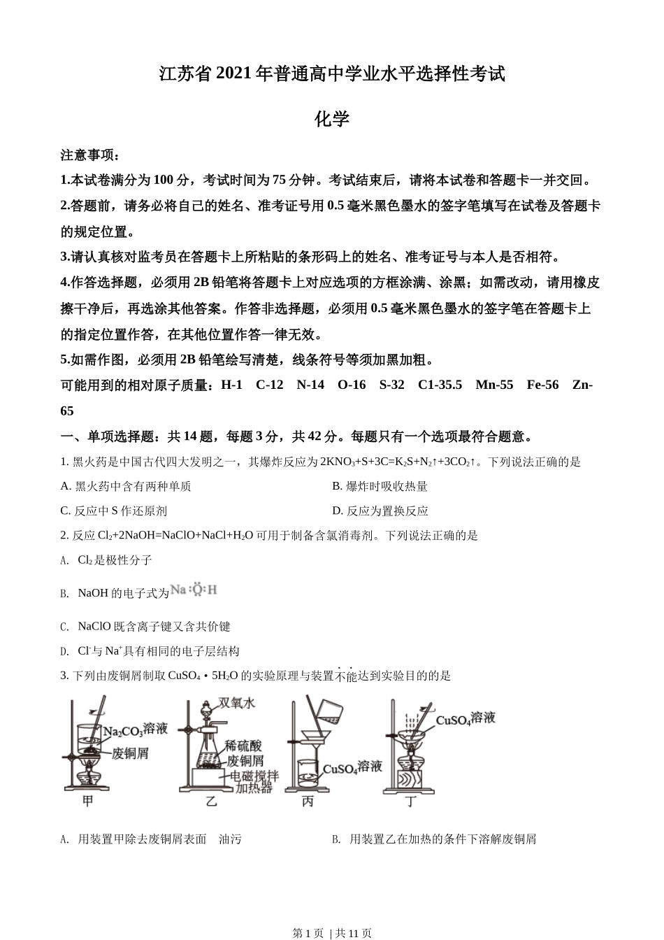江苏省2021年普通高中学业水平选择性考试化学注意事项:1.本试卷满分为100分,考试时间为75分钟。考试结束后,请将本试卷和答题卡一并交回。2.答题前,请务必将自己的姓名、准考证号用0.5毫米黑色墨水的签字笔填...