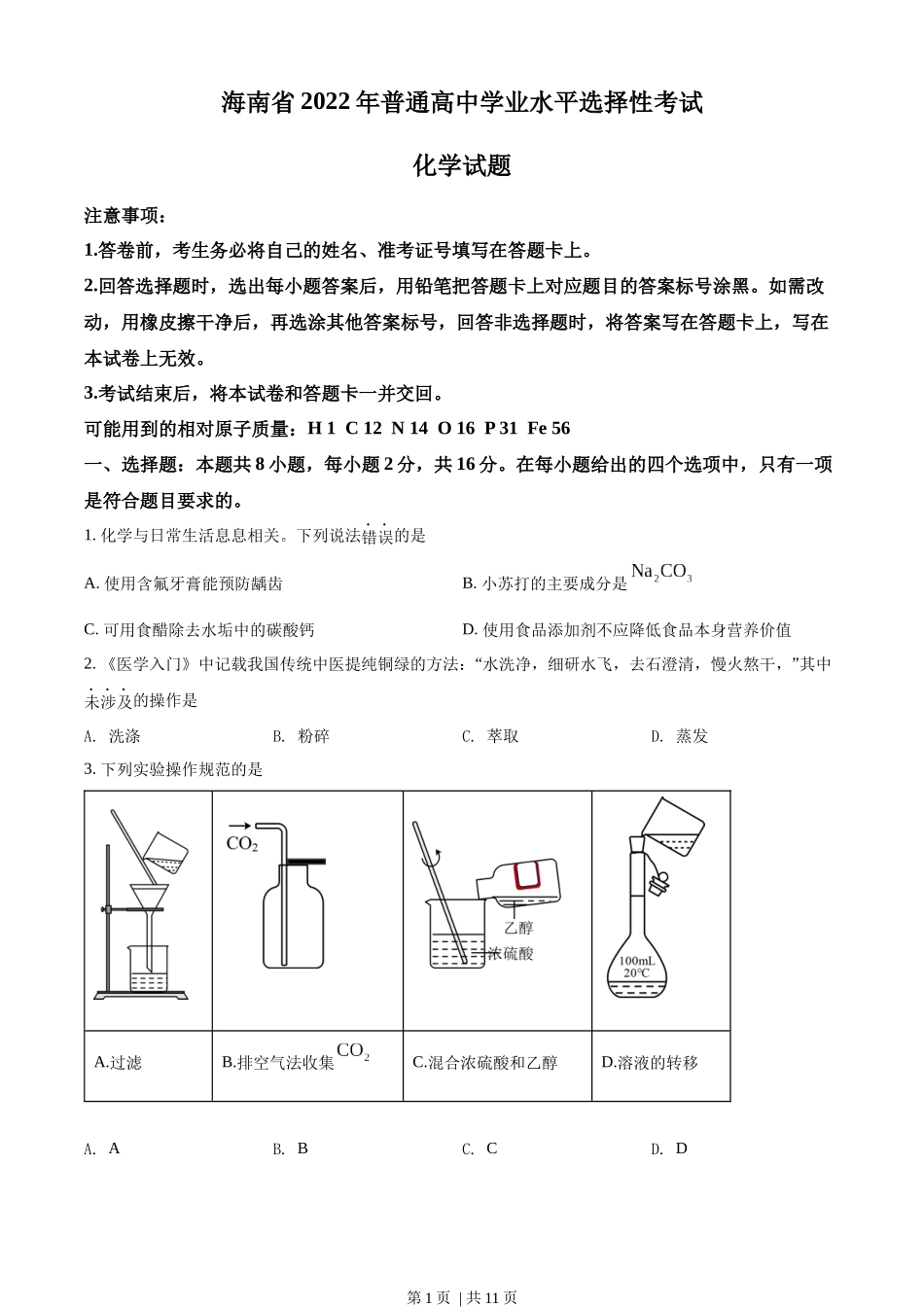 海南省2022年普通高中学业水平选择性考试化学试题注意事项:1.答卷前,考生务必将自己的姓名、准考证号填写在答题卡上。2.回答选择题时,选出每小题答案后,用铅笔把答题卡上对应题目的答案标号涂黑。如需改动,...
