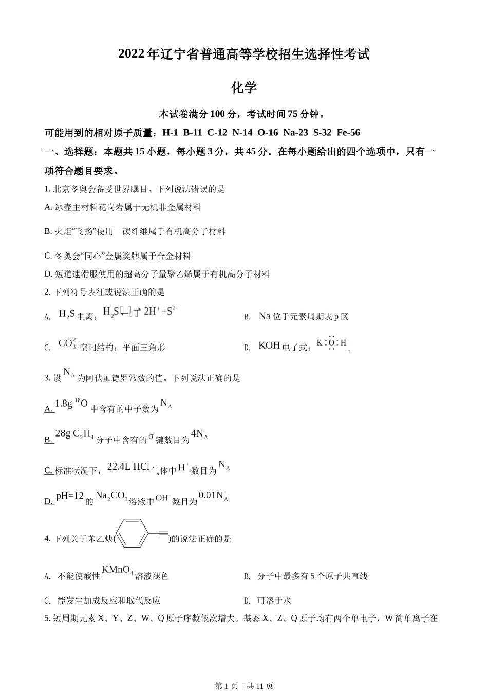 2022年辽宁省普通高等学校招生选择性考试化学本试卷满分100分,考试时间75分钟。可能用到的相对原子质量:H-1B-11C-12N-14O-16Na-23S-32Fe-56一、选择题:本题共15小题,每小题3分,共45分。在每小题给出的四个选...