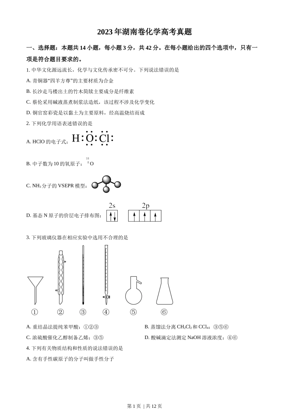 2023年高考化学试卷(湖南)(空白卷).docx_第1页
