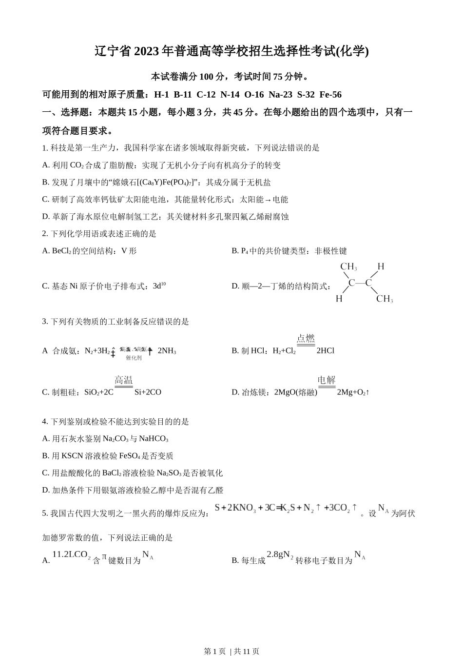 辽宁省2023年普通高等学校招生选择性考试(化学)本试卷满分100分,考试时间75分钟。可能用到的相对原子质量:H-1B-11C-12N-14O-16Na-23S-32Fe-56一、选择题:本题共15小题,每小题3分,共45分。在每小题给出的四个...