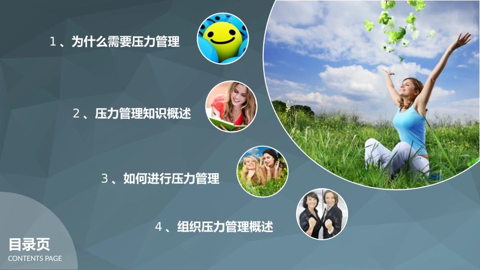 培训人:心理压力管理员工在职培训之——LOGO1、为什么需要压力管理2、压力管理知识概述3、如何进行压力管理4、组织压力管理概述目录页CONTENTSPAGE过渡页TRANSITIONPAGE第一章为什么需要压力管理请思考:不管理...