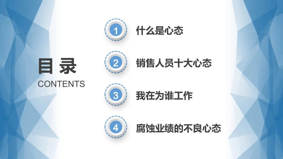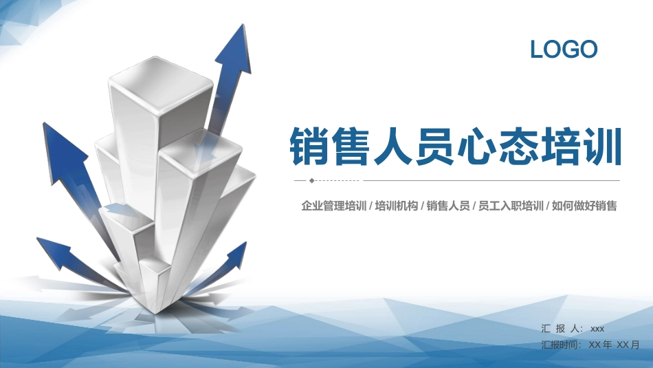 LOGO销售人员心态培训企业管理培训/培训机构/销售人员/员工入职培训/如何做好销售汇报人:xxx汇报时间:XX年XX月目录CONTENTS1什么是心态2销售人员十大心态3我在为谁工作4腐蚀业绩的不良心态什么是心态Whatisment...