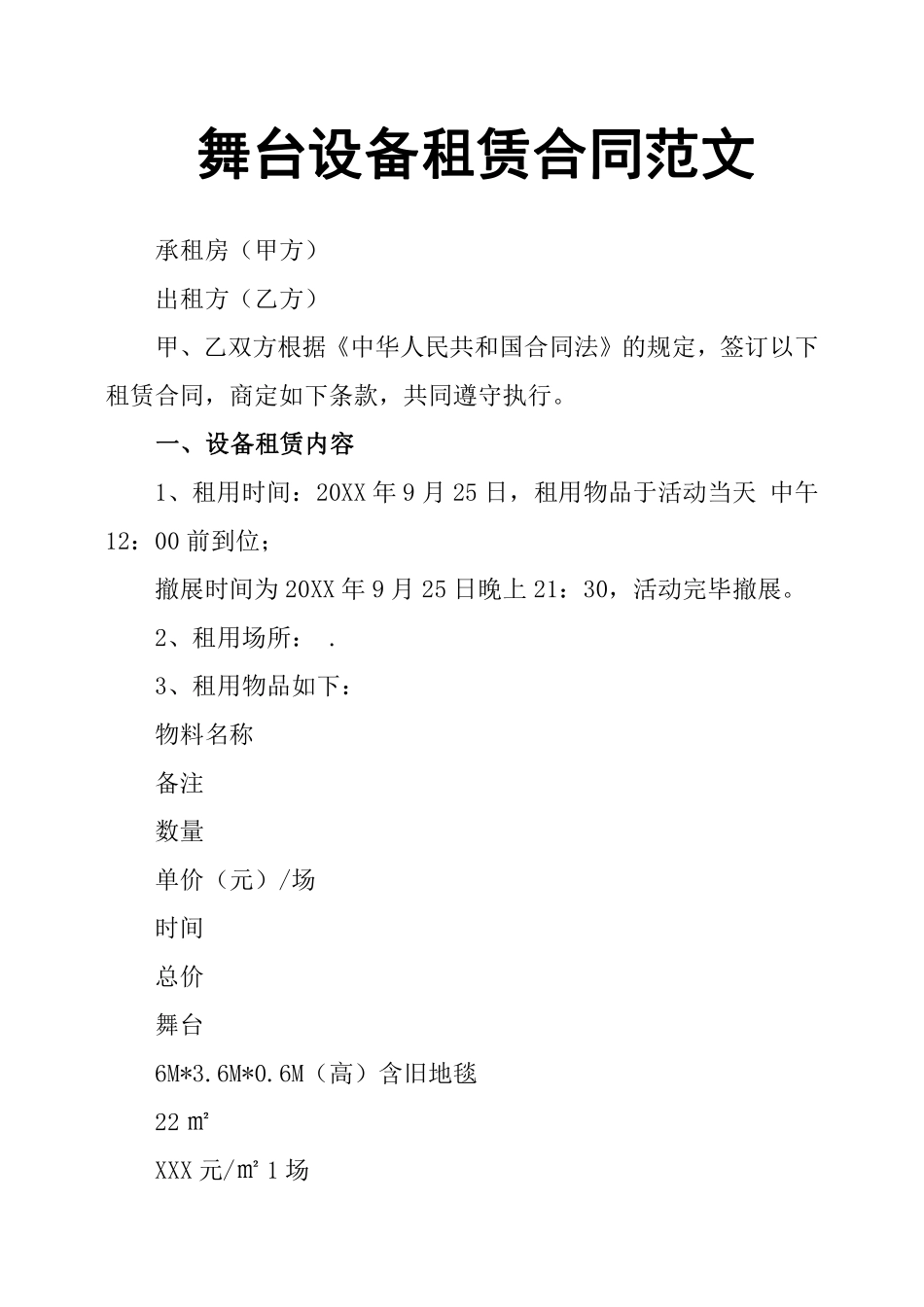 舞台设备租赁合同范文承租房(甲方)出租方(乙方)甲、乙双方根据《中华人民共和国合同法》的规定,签订以下租赁合同,商定如下条款,共同遵守执行。一、设备租赁内容1、租用时间:20XX年9月25日,租用物品于活...