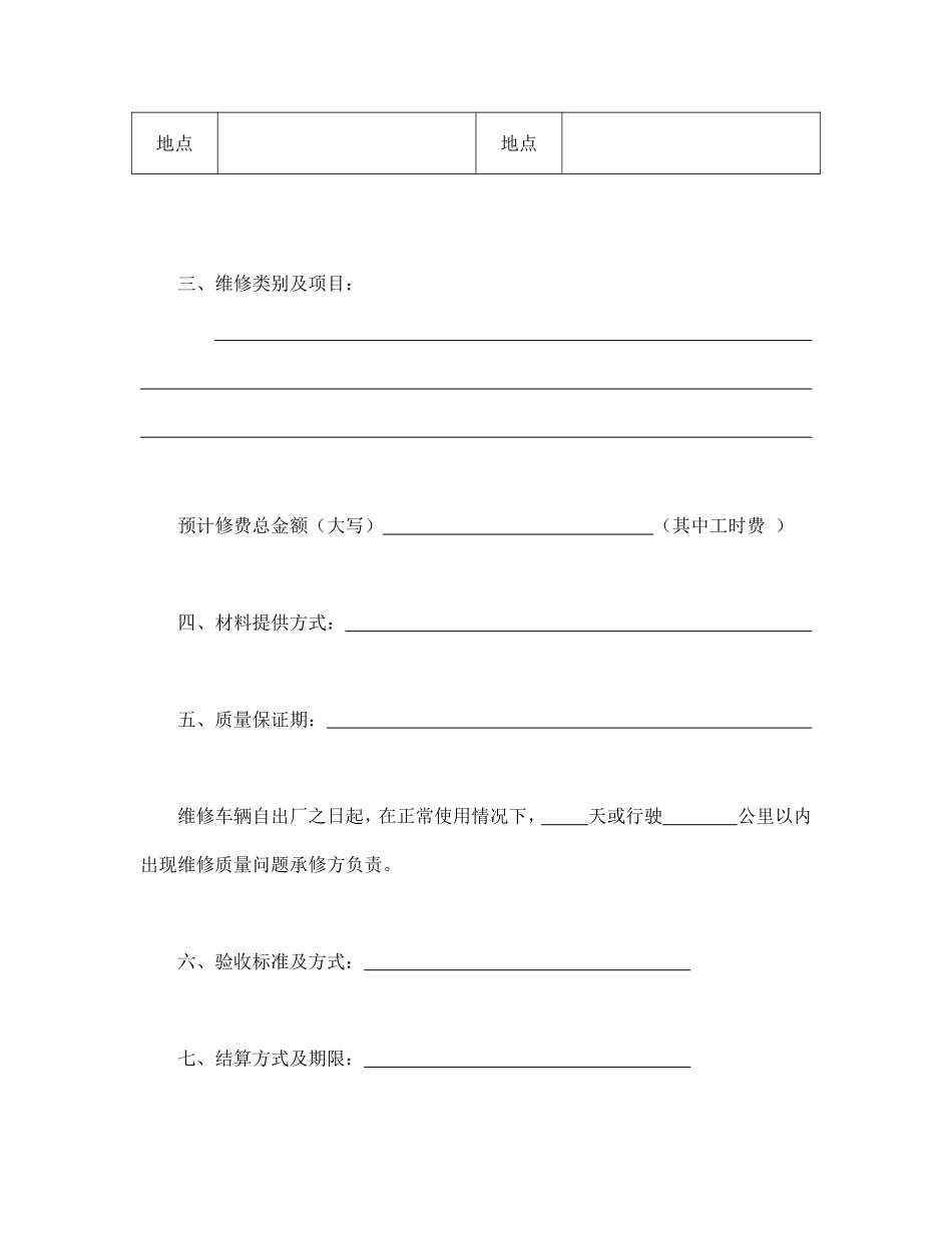 汽车维修合同GF-92-0304托修方:签订时间:合同编号:承修方:签订地点:一、车辆型号:车种牌照号发动机型号车型底盘号编号二、车辆交接期限(事宜):送修接车日期方式日期方式地点地点三、维修类别...