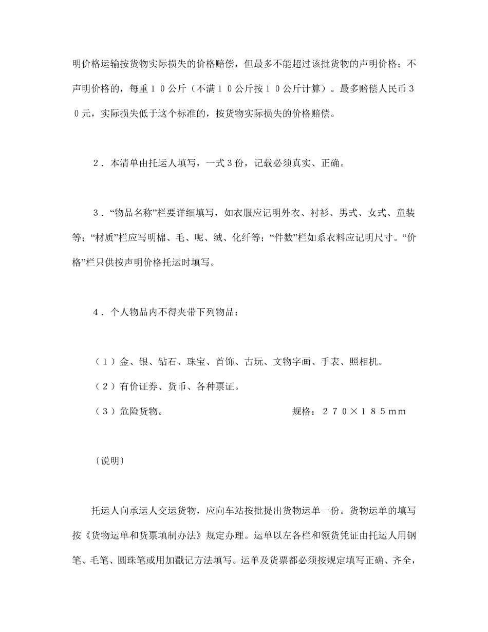 物品清单(3)发站:货票第号货件编号包装详细内容件数或尺寸重量价格物品名称材质新旧程度托运人盖章或签字年月日注意事项1.个人托运的货物在货物运单上不明确填写货物具体名称的(如搬家货物、行李),分为声...