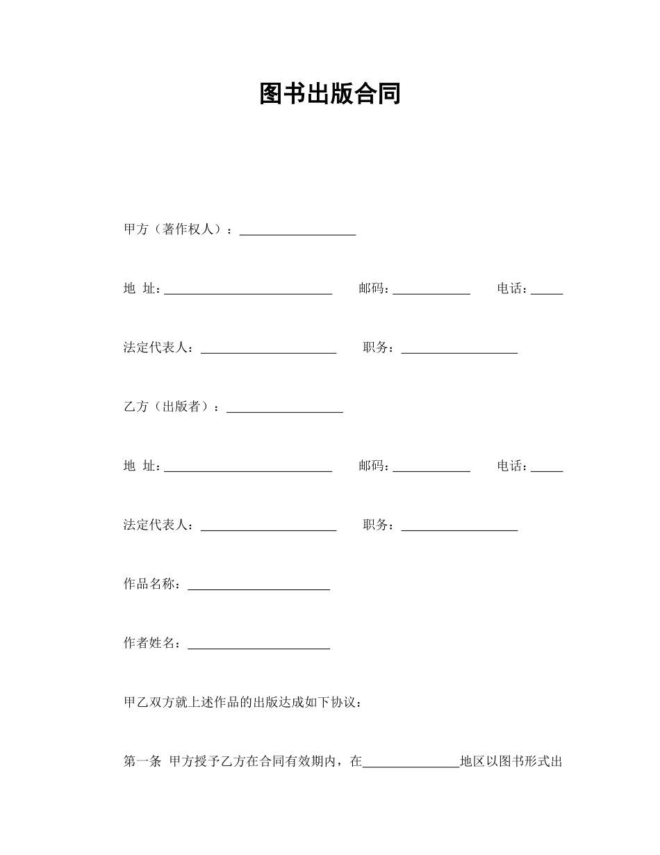 图书出版合同甲方(著作权人):地址:邮码:电话:法定代表人:职务:乙方(出版者):地址:邮码:电话:法定代表人:职务:作品名称:作者姓名:甲乙双方就上述作品的出版达成如下协议:第一条甲方授予乙方在...