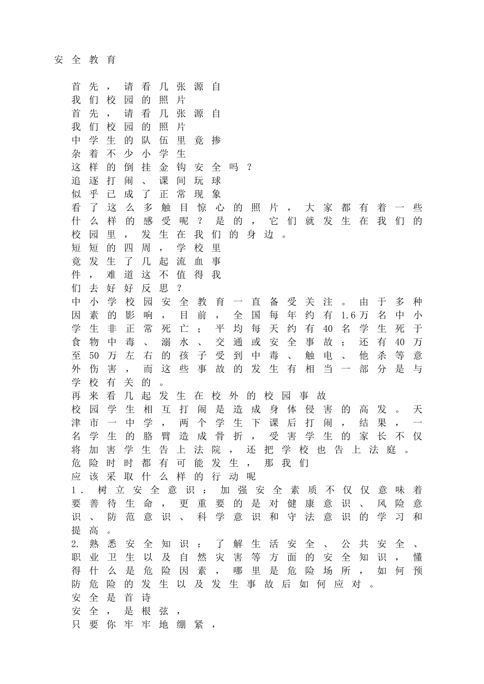 安全教育首先,请看几张源自我们校园的照片首先,请看几张源自我们校园的照片中学生的队伍里竟掺杂着不少小学生这样的倒挂金钩安全吗?追逐打闹、课间玩球似乎已成了正常现象看了这么多触目惊心的照片,大家都有...