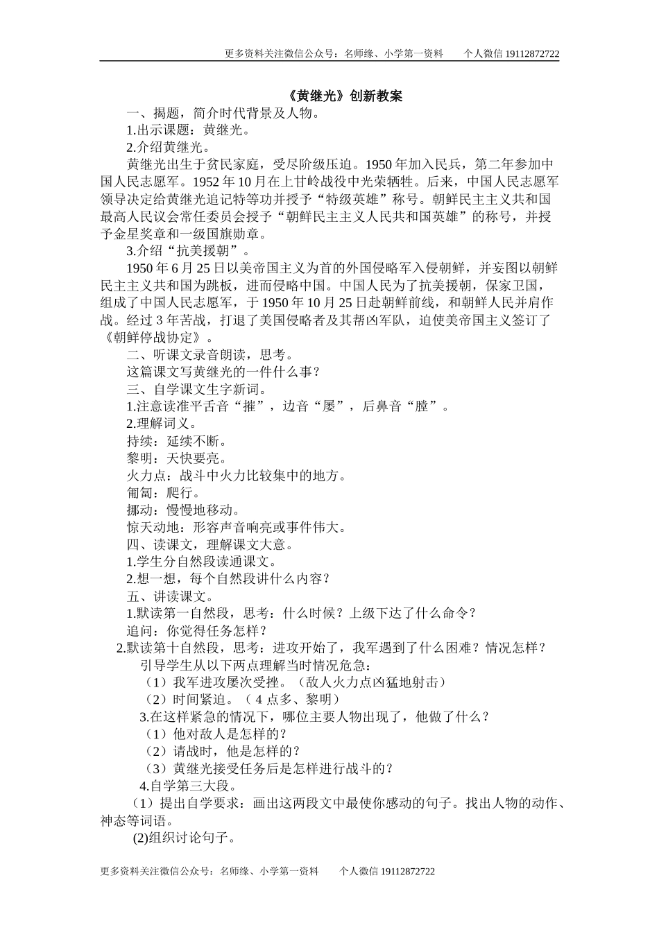 更多资料关注微信公众号:名师缘、小学第一资料个人微信19112872722《黄继光》创新教案一、揭题,简介时代背景及人物。1.出示课题:黄继光。2.介绍黄继光。黄继光出生于贫民家庭,受尽阶级压迫。1950年加入民兵,...