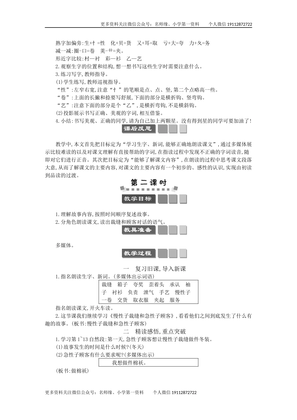 更多资料关注微信公众号:名师缘、小学第一资料个人微信19112872722教学要求1.会认“夸、箱”等10个字,读准多音字“缝、夹”,会写“性、卷”等12个字,正确读写“性子、布料”等词语。2.分角色朗读课文,读出裁缝和...