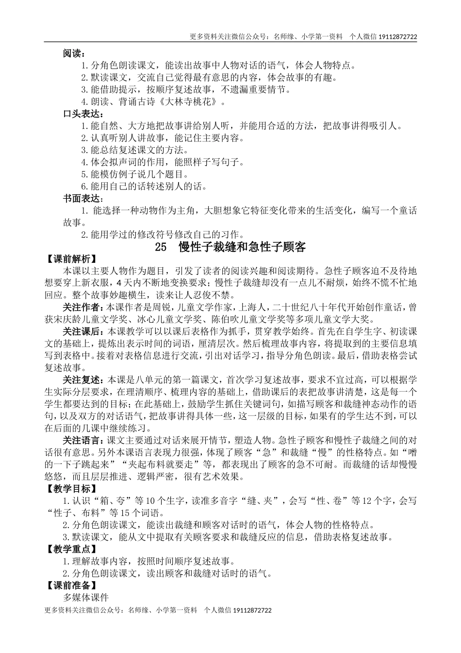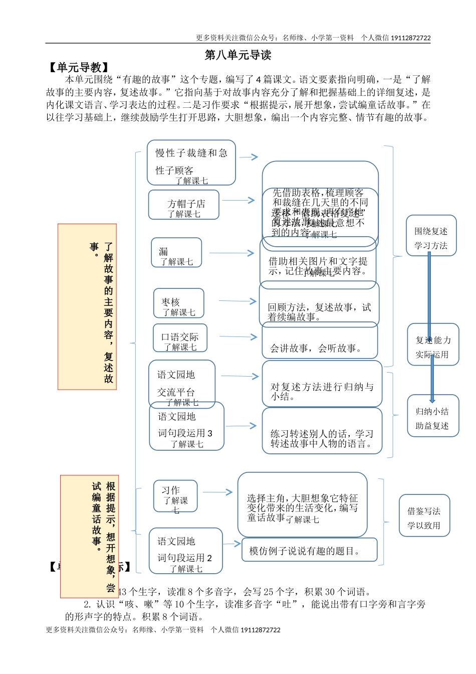 更多资料关注微信公众号:名师缘、小学第一资料个人微信19112872722第八单元导读【单元导教】本单元围绕“有趣的故事”这个专题,编写了4篇课文。语文要素指向明确,一是“了解故事的主要内容,复述故事。”它指...