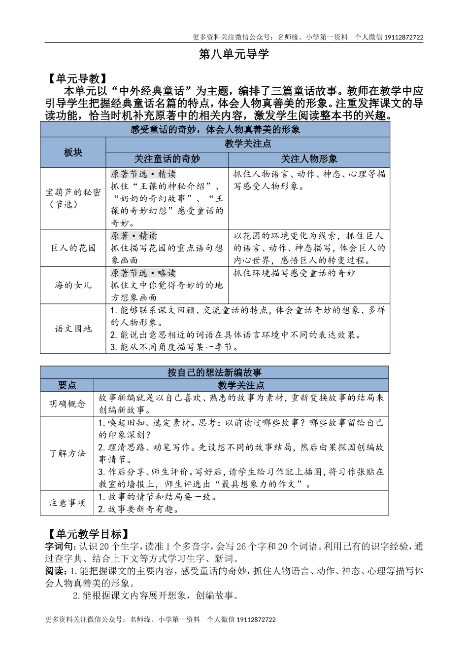 更多资料关注微信公众号:名师缘、小学第一资料个人微信19112872722第八单元导学【单元导教】本单元以“中外经典童话”为主题,编排了三篇童话故事。教师在教学中应引导学生把握经典童话名篇的特点,体会人物真善...