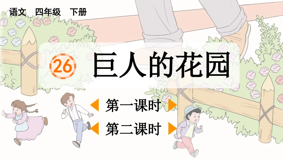 语文四年级下册巨人的花园26第一课时第二课时看看下面的插图,你能想象巨人的样子吗?一起来看看作家王尔德的笔下的巨人吧!第一课时王尔德,十九世纪后期英国著名作家、诗人、剧作家,唯美主义的代表人物。主要...