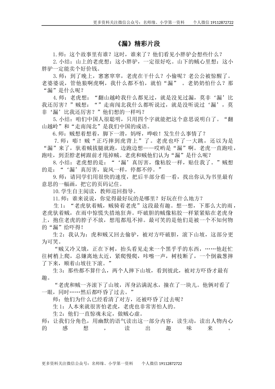 更多资料关注微信公众号:名师缘、小学第一资料个人微信19112872722《漏》精彩片段1.师:这个故事里有谁?这时,谁来了?他们看见小胖驴会想些什么?2.小结:山上的老虎想:这小胖驴,一定很好吃。山下的贼心里想...
