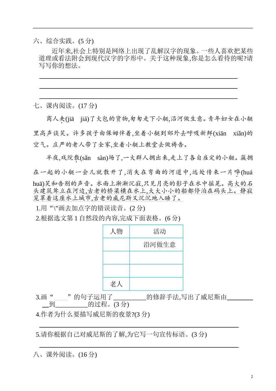 12019-2020学年下学期五年级期末检测卷一、用“”画出加点字的正确读音。(6分)昼夜(zòuzhòu)眺望(tiàotiǎo)踌躇(chóuchú)桅杆(wéiwēi)玷污(diànzhān)土匪(fěifēi)二、读句子,看拼音,写词语。(6分)1....