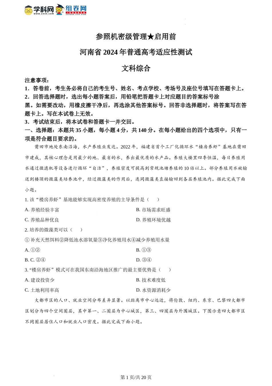参照机密级管理★启用前河南省2024年普通高考适应性测试文科综合注意事项:1.答卷前,考生务必将自己的考生号、姓名、考点学校、考场号及座位号填写在答题卡上。2.回答选择题时,选出每小题答案后,用铅笔把答...