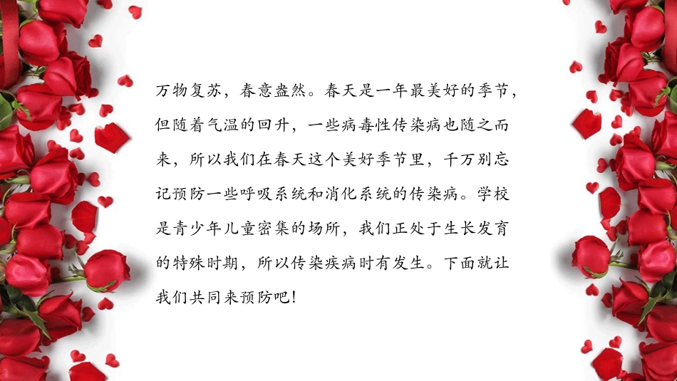 春季常见疾病预防小知识一年级主题班队会万物复苏,春意盎然。春天是一年最美好的季节,但随着气温的回升,一些病毒性传染病也随之而来,所以我们在春天这个美好季节里,千万别忘记预防一些呼吸系统和消化系统的...