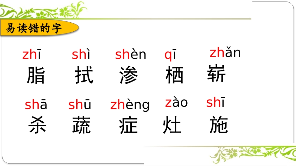 第二单元复习语文四年级下册易读错的字脂zhī拭shì渗shèn崭zhǎn栖qī杀shā蔬shū症灶施zhèngzàoshī晌—响晌餐番臭预健容易混淆未末未来末尾容易写成别字易写错的字疾:①病。②痛苦;疼痛。③痛恨。④快;...