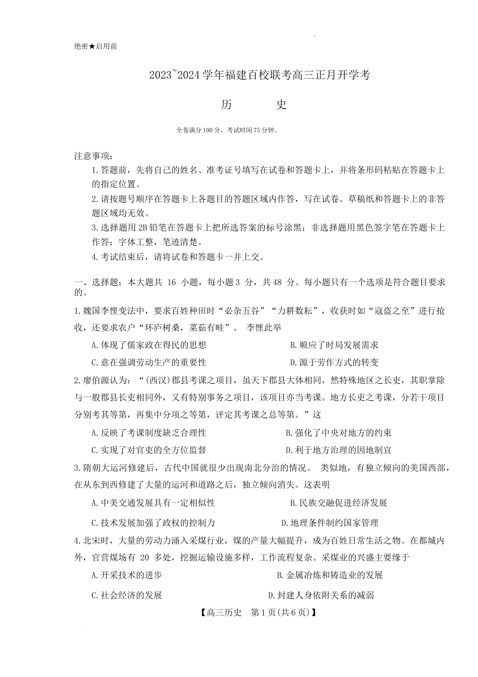 绝密★启用前2023~2024学年福建百校联考高三正月开学考历史全卷满分100分,考试时间75分钟。注意事项:1.答题前,先将自己的姓名、准考证号填写在试卷和答题卡上,并将条形码粘贴在答题卡上的指定位置。2.请按题...