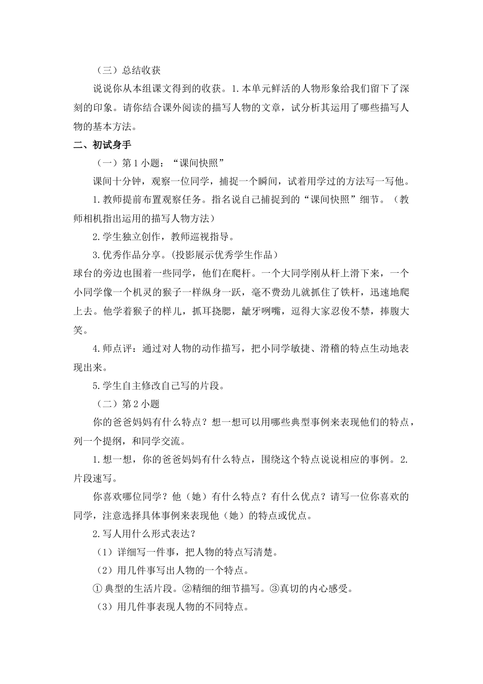 交流平台与初试身手[教学目标]1.学习描写人物的基本方法。2.初步运用描写人物的方法。[教学重难点]学习描写人物的基本方法。[教学课时]1课时教学过程一、学习“交流平台”(一)谈话导入同学们,我们在写人...