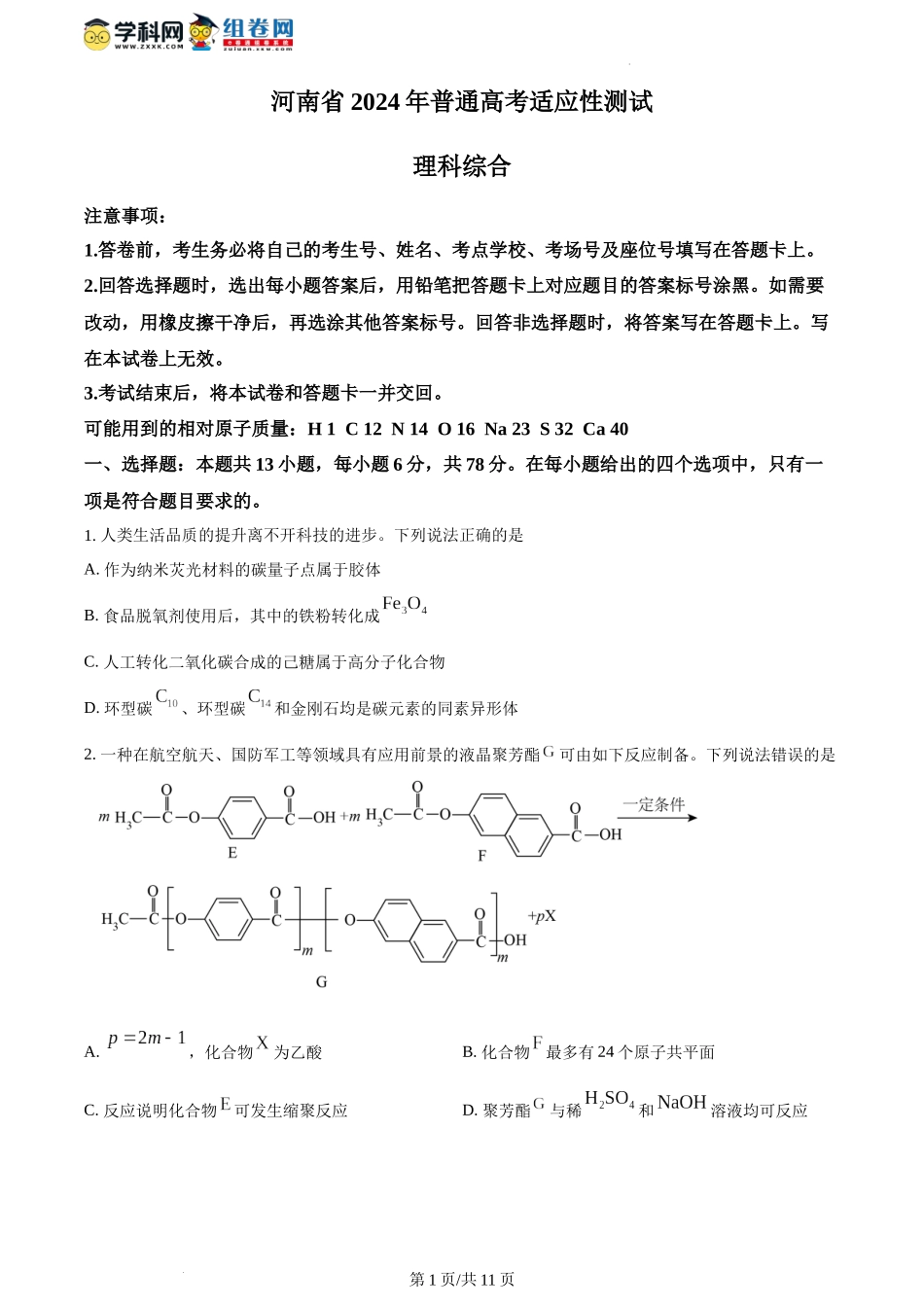 河南省2024年普通高考适应性测试理科综合注意事项:1.答卷前,考生务必将自己的考生号、姓名、考点学校、考场号及座位号填写在答题卡上。2.回答选择题时,选出每小题答案后,用铅笔把答题卡上对应题目的答案标号...
