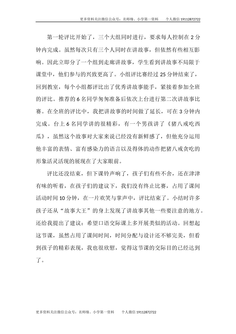 更多资料关注微信公众号:名师缘、小学第一资料个人微信19112872722口语交际《趣味故事会》教学反思本次口语交际是“趣味故事会”,是我安排的让学生讲讲人物故事的一次活动。可以讲课本里面的,也可以讲课外的,...