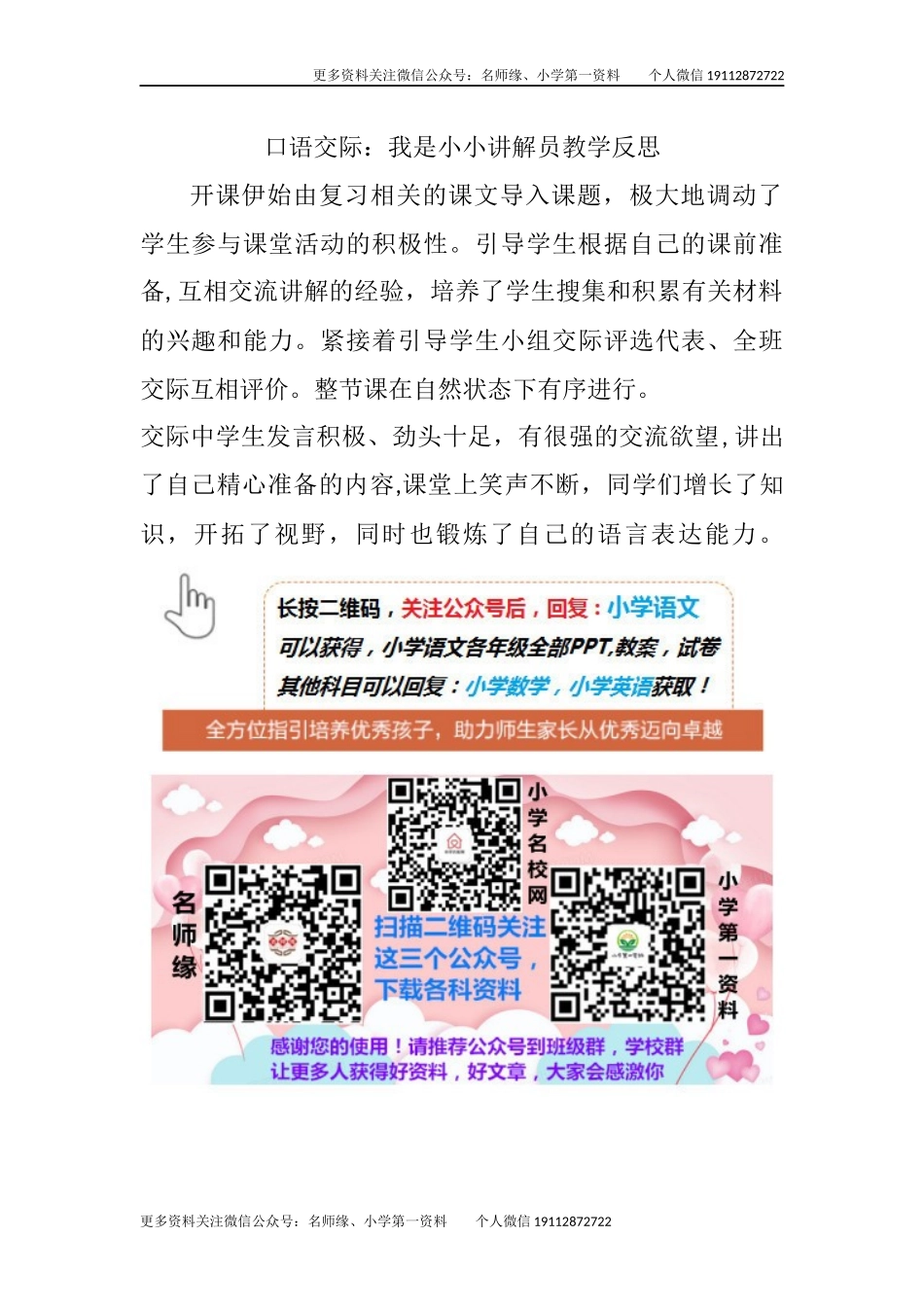 更多资料关注微信公众号:名师缘、小学第一资料个人微信19112872722口语交际:我是小小讲解员教学反思开课伊始由复习相关的课文导入课题,极大地调动了学生参与课堂活动的积极性。引导学生根据自己的课前准备,互...