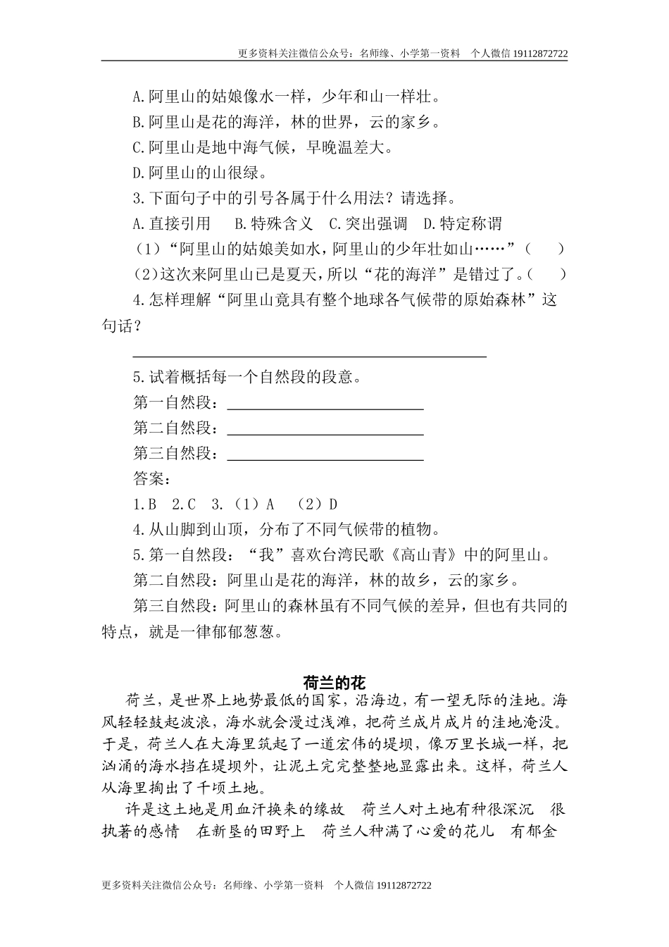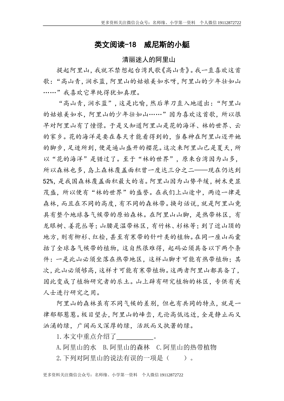 更多资料关注微信公众号:名师缘、小学第一资料个人微信19112872722类文阅读-18威尼斯的小艇清丽迷人的阿里山提起阿里山,我就不禁想起台湾民歌《高山青》。我一直喜欢这首歌:“高山青,涧水蓝,阿里山的姑娘美...