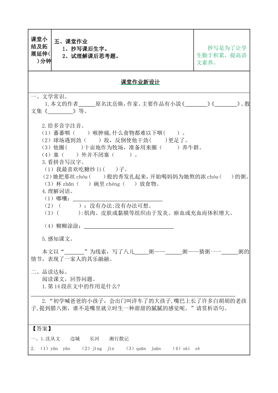 课题腊八粥课型精读课文授课时间2课时教学目标1.自主学习字词,会认会写“腊、粥、腻、栗”等15个生字,理解字义,识记字形。正确读写“糊涂、搅和、浓稠、可靠、猜想”等词语。2.有感情地朗读课文,通过人物动作...
