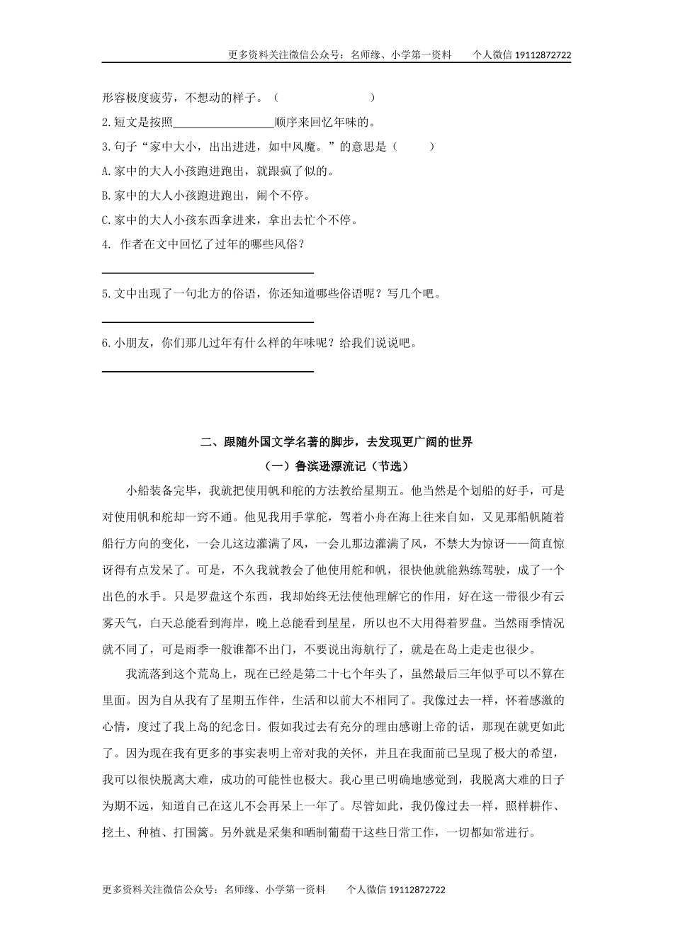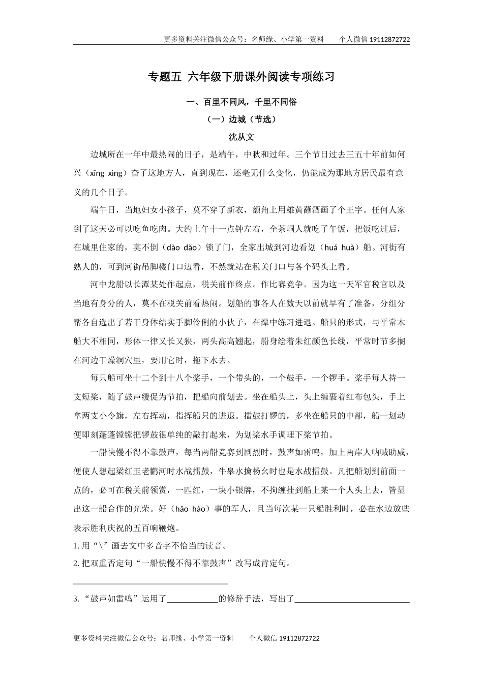 更多资料关注微信公众号:名师缘、小学第一资料个人微信19112872722专题五六年级下册课外阅读专项练习一、百里不同风,千里不同俗(一)边城(节选)沈从文边城所在一年中最热闹的日子,是端午,中秋和过年。三个...