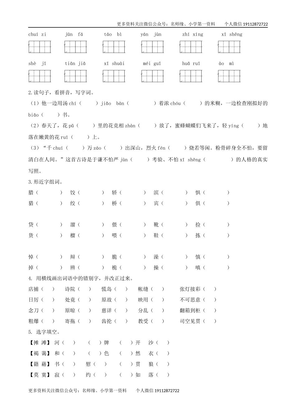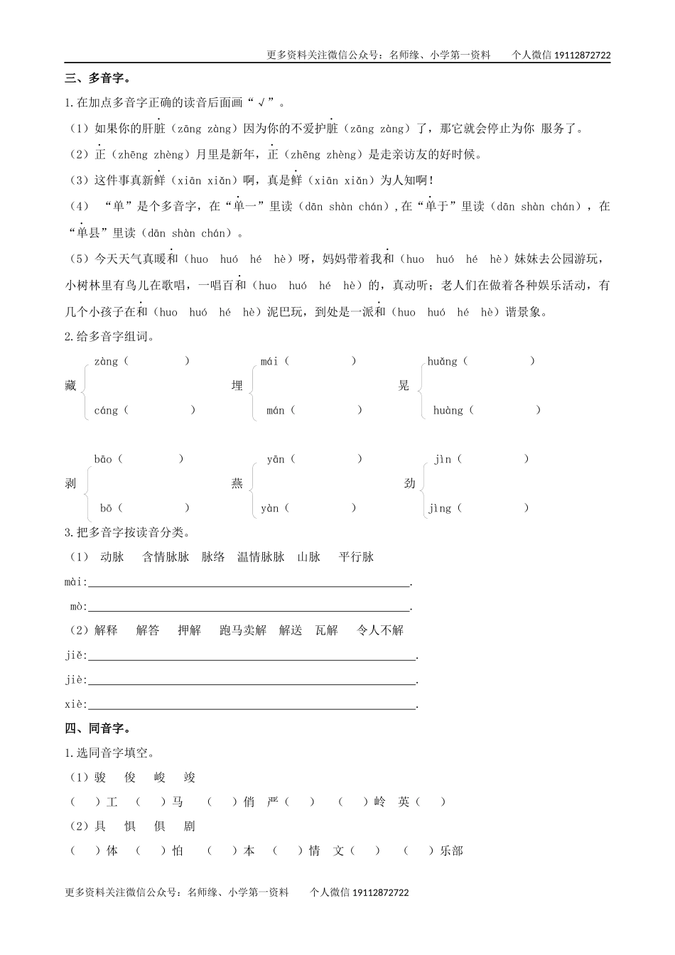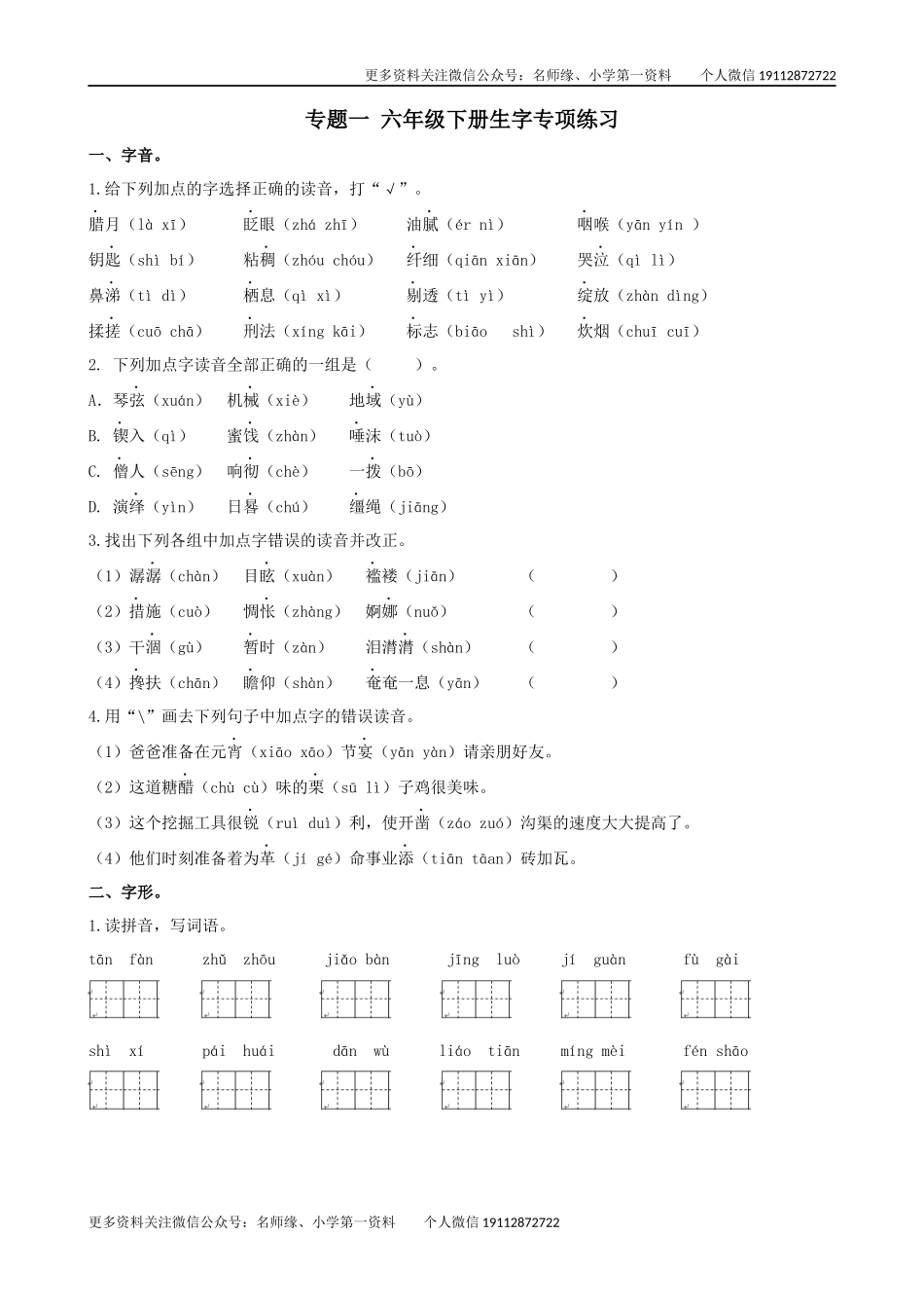 更多资料关注微信公众号:名师缘、小学第一资料个人微信19112872722专题一六年级下册生字专项练习一、字音。1.给下列加点的字选择正确的读音,打“√”。腊月(làxī)眨眼(zházhī)油腻(érnì)咽喉(yān...