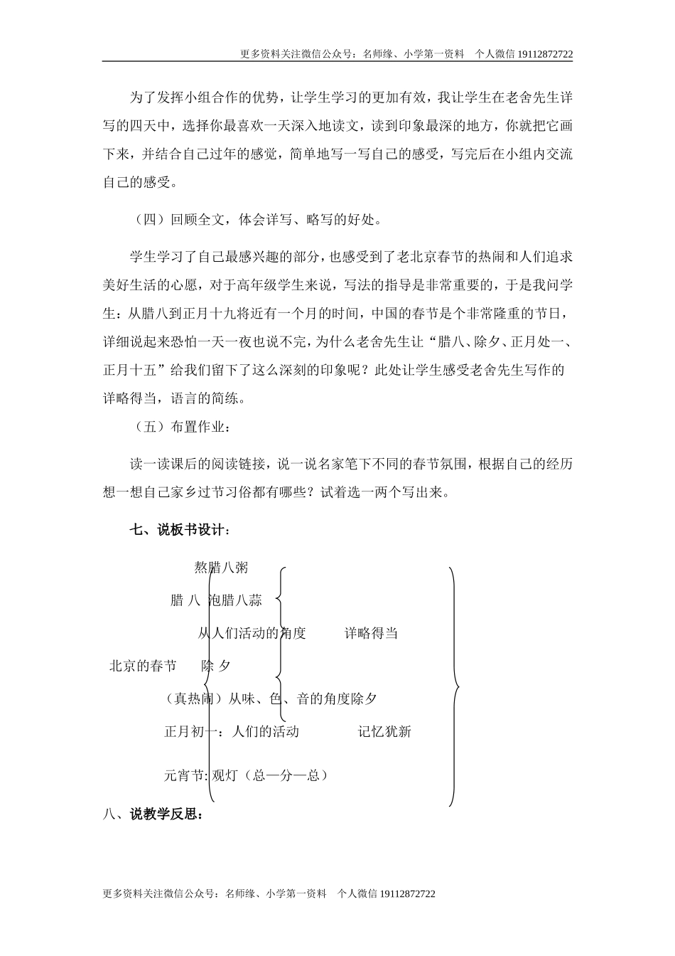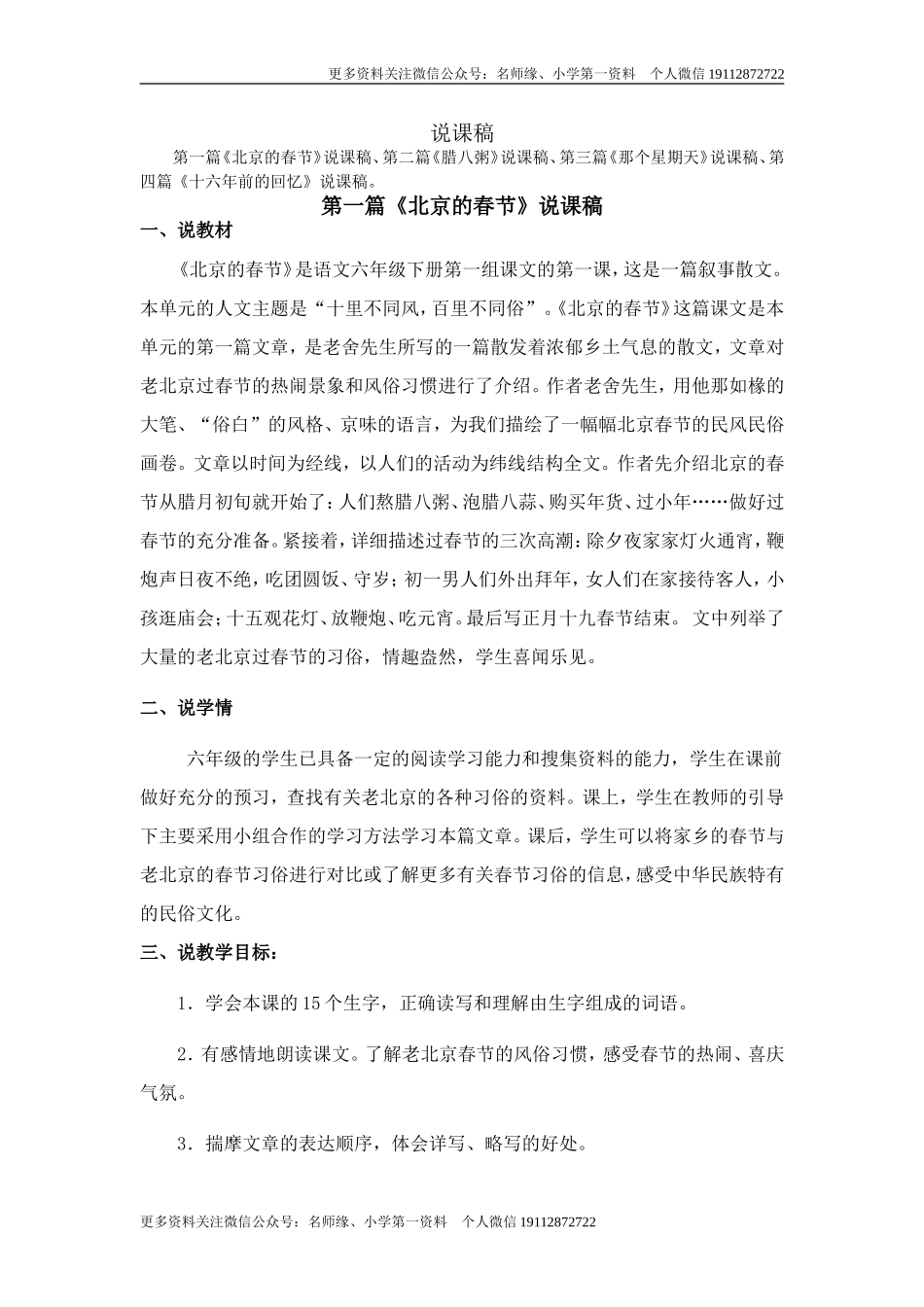 更多资料关注微信公众号:名师缘、小学第一资料个人微信19112872722说课稿第一篇《北京的春节》说课稿、第二篇《腊八粥》说课稿、第三篇《那个星期天》说课稿、第四篇《十六年前的回忆》说课稿。第一篇《北京的春...