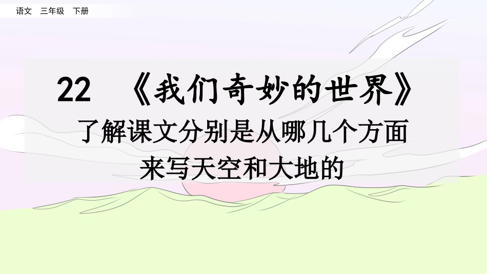 语文三年级下册22《我们奇妙的世界》了解课文分别是从哪几个方面来写天空和大地的22我们奇妙的世界回顾内容本文通过描写天空从清晨到夜晚的缤纷色彩、奇妙景象以及大地一年四季美丽的风光,表现了世界的奇妙,说...