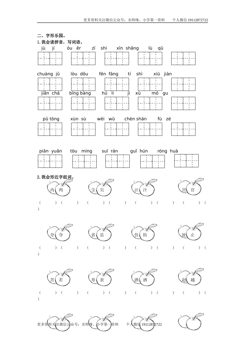 更多资料关注微信公众号:名师缘、小学第一资料个人微信19112872722生字专项一、字音天地。1.下列四组中声母相同的一组是()。A.鸳翼涯验B.惠痕释幻C.执栅阻择D.呈储衬旭2.下面四组词语的读音没有错误的是()。...